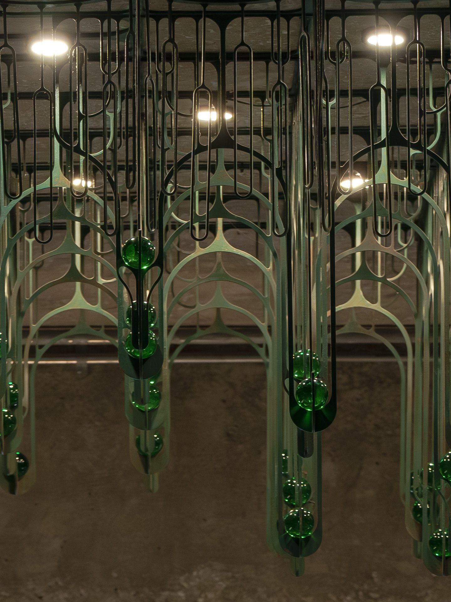 Welcome to Niko Neko Gelato Bar. I am delighted to present my installations, "Drip" and "Mini Drip." These works reflect my passion for matcha and my love for merging industrial materials with organic forms. The main ceiling sculpture, "Drip," is meticulously crafted from steel and features a green copper patina that evokes the vibrant hue of matcha powder. Inspired by the fluidity of melting ice cream, this sculpture captures the essence of liquid in motion, appearing to drip from the raw, rustic concrete ceiling, with green crystal balls delicately perched at the tips. This interplay between the patina-coated steel and the bare concrete creates a harmonious balance between natural and industrial elements.
